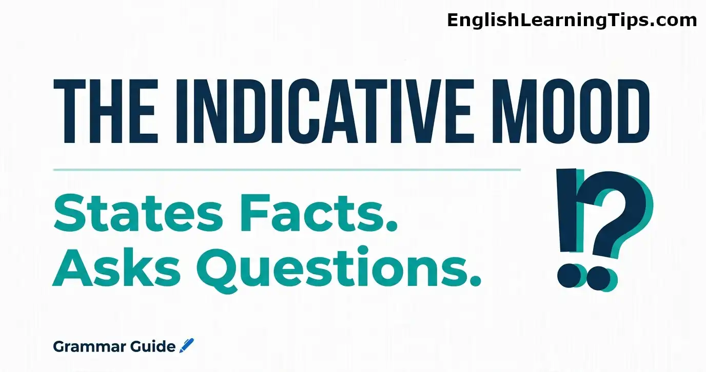 A professional grammar guide graphic titled "The Indicative Mood" with the subheadline "States Facts. Asks Questions." against a clean white textured background with a stylized exclamation and question mark icon.